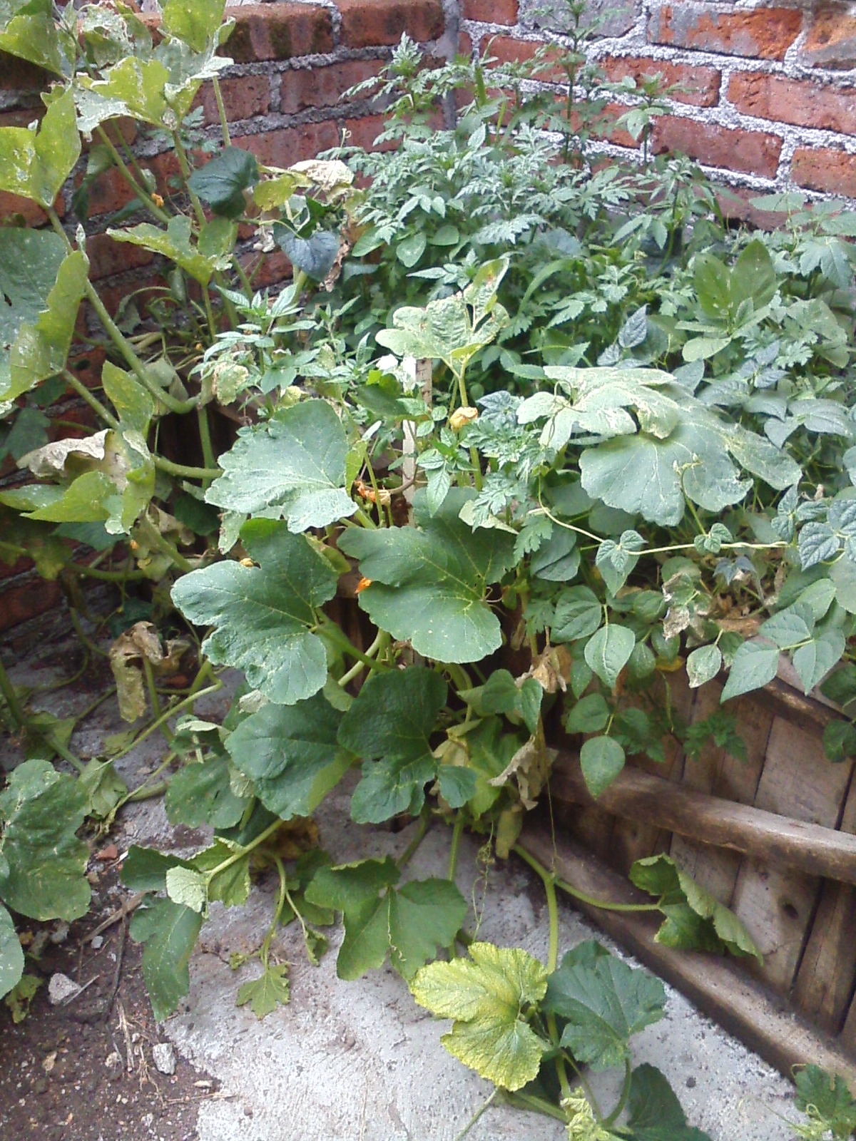 On the other hand, several plants sprouted without being cultivated. So far, the backyard has random tomato, squash, bean and tomatillo plants, along with the regular yearly explosion of feverfew. Neither the chickens nor the cats seem interested in any of these plants, so I hope they will be allowed to grow to fruit or flower-bearing stage.