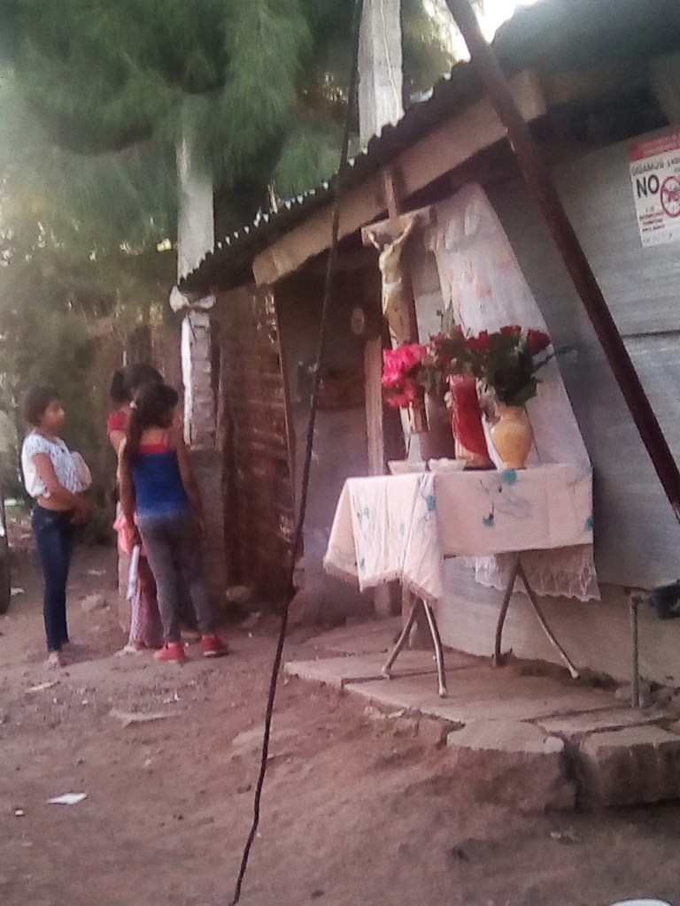 So since Mama Sofia couldn’t get a mass scheduled at the church at the 24-hour mark, the priest did a full mass right there on the dirt street, in front of the cardboard house that sheltered Mama Sofia’s body. He enlisted an altar boy. C. set up the altar on a folding table and hung a large Christ image from the roof. He enlisted a woman to read some bible passages. He enlisted 2 ladies to pass the collection dishes. And he enlisted me.